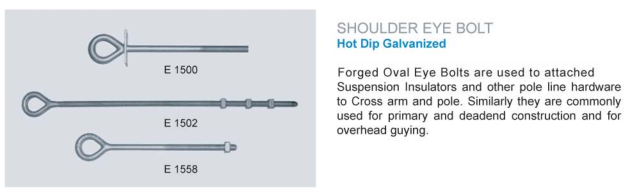 oval eye bolts are used to attached suspension insulators and other pole line hardware to cross arm and pole. similarly they are commonly used for primary and deadend construciton and for oerhead guying.